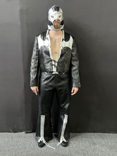 He’s the boxer, stepping into the ring already armored. A black and silver ranchero mask conceals his face, matched by a black leather jacket embossed with silver embossed appliqué. Trousers in the same leather and appliqué complete the set, a uniform that is as much spectacle as an attack against the weary eyes of his opponent.